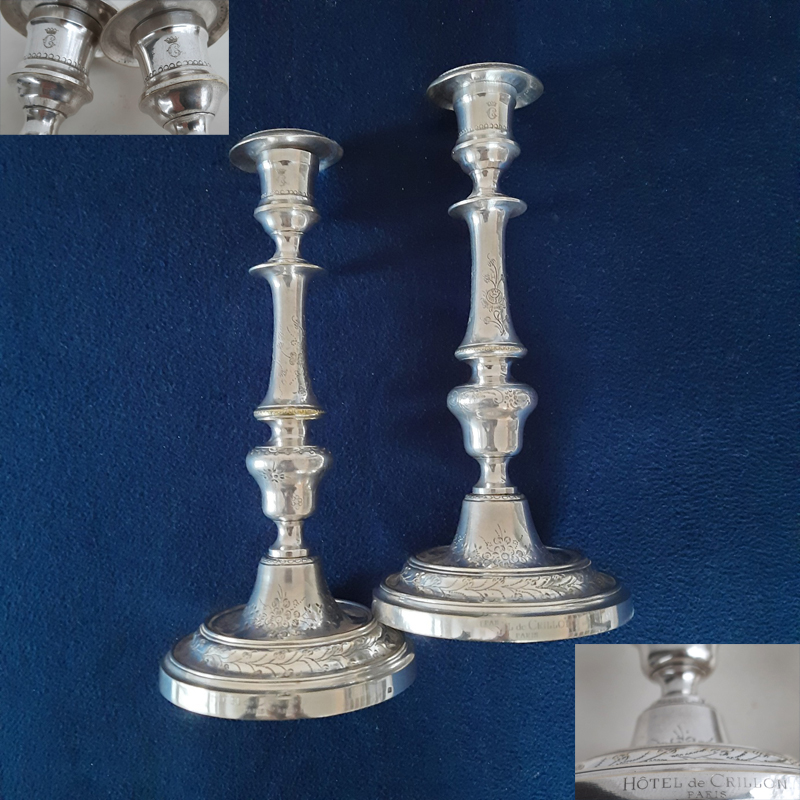 Each candlestick bears the inscription beneath the socket: “C with crown” and “Hôtel de Crillon Paris”