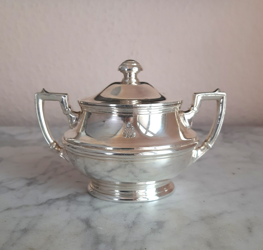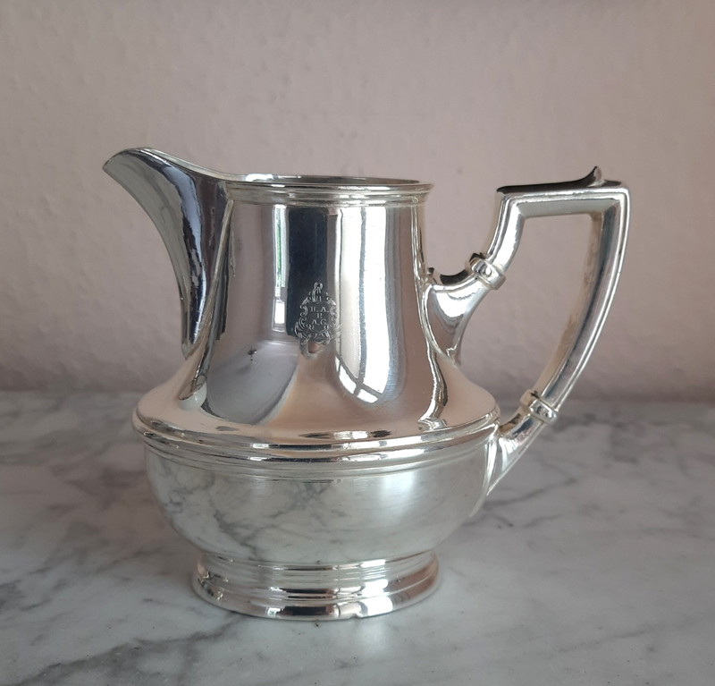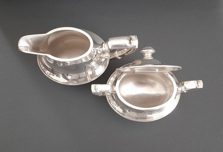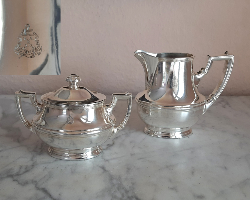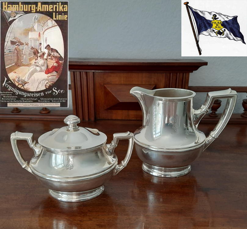 Antikes Zucker/Sahne Set um 1910, versilbert – Wellner, 1st-class-Service Hamburg-Amerika-Linie (H.A.P.A.G.)