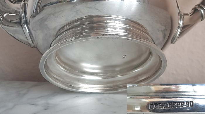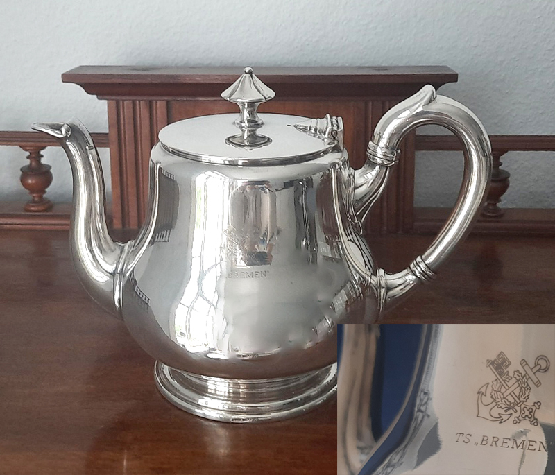 Große maritime Teekanne um 1930 versilbert Gebr. Hepp aus dem Bordgeschirr der 1. Klasse des Luxusdampfers „BREMEN“
