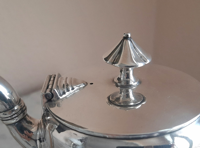 Flat hinged lid with a centrally placed floral finial. Deep-set, elegantly curved spout on one side.