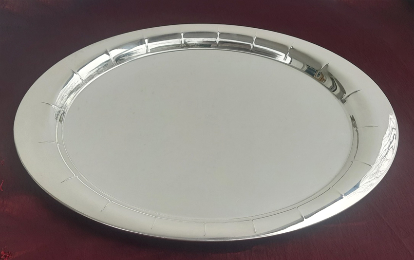 A simple, elegant oval tray with a recessed central well. The raised rim curves outward