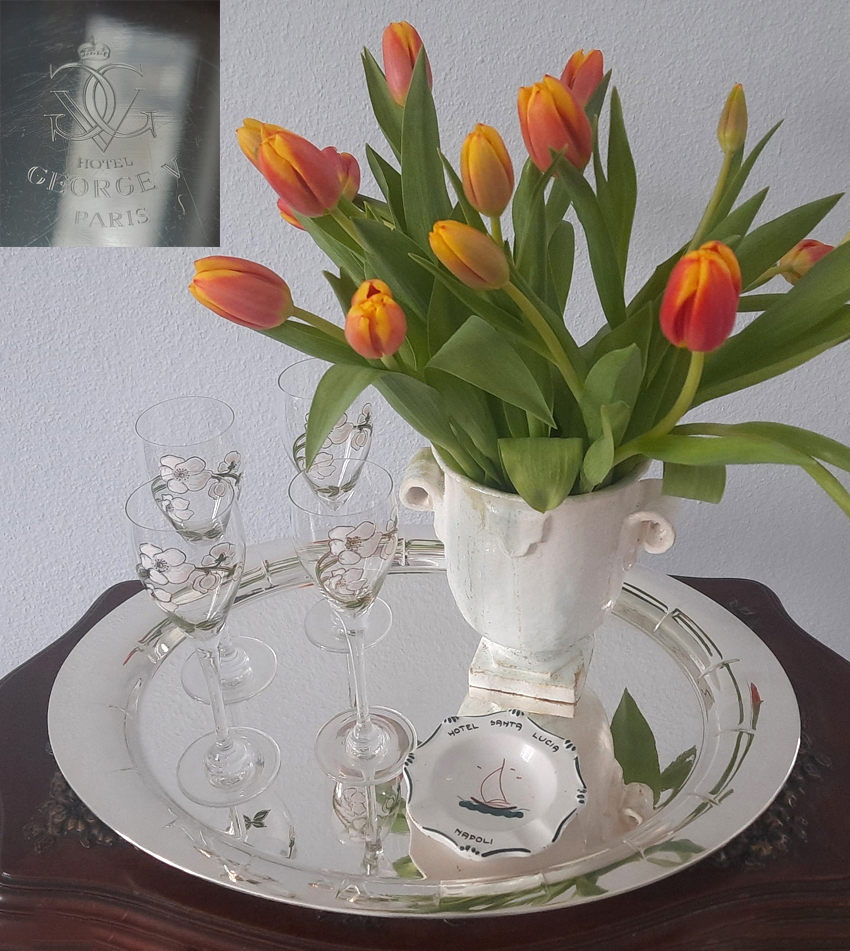 die der Servierplatte eine sehr schöne Alterspatina verleihen. Die originale Versilberung ist gut erhalten.