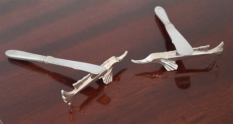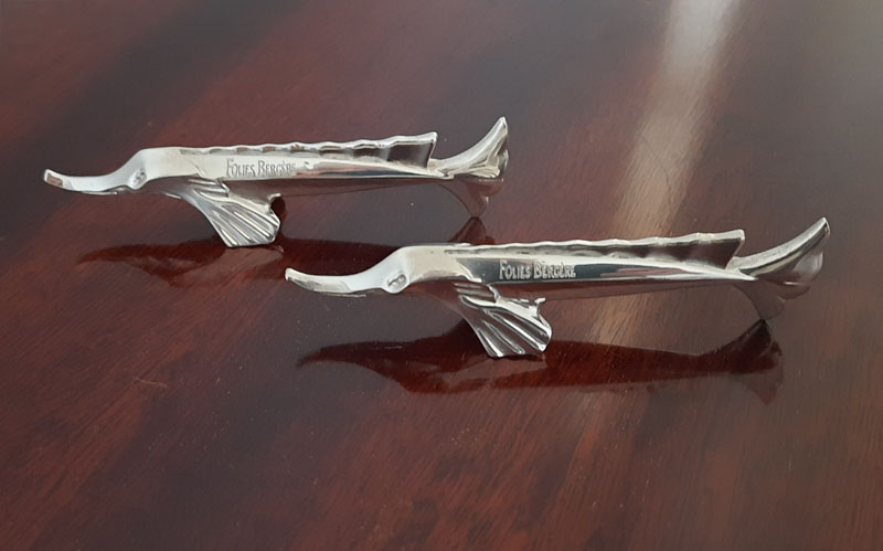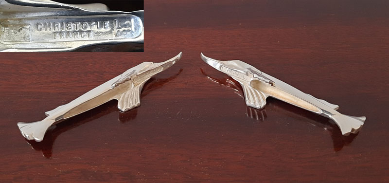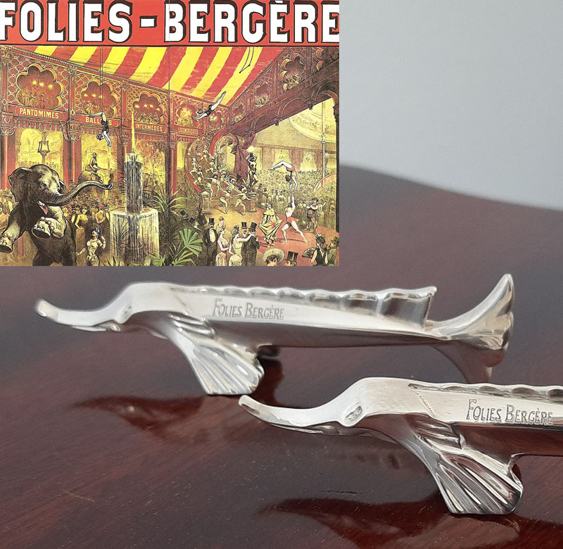 Paar figürliche Messerbänkchen 1950er Jahre Künstler-Entwurf versilbert Christofle aus legendärem Pariser Revue-Theater