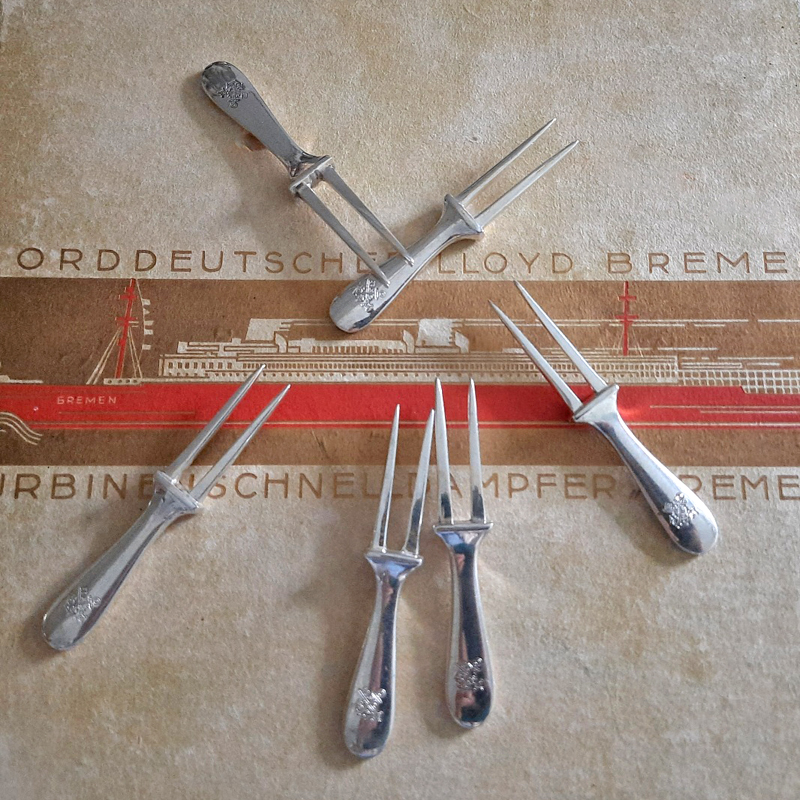 Rarität! 6 Cocktailspieße von 1929 versilbert Koch & Bergfeld 1st-class-Service TS BREMEN, Norddeutscher Lloyd